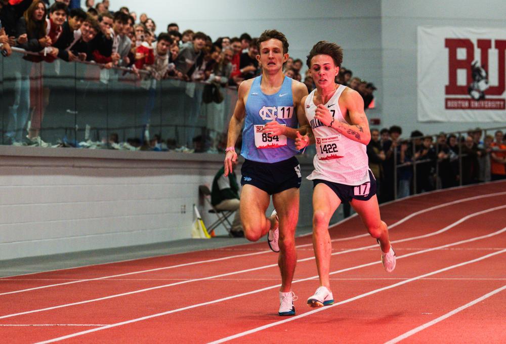 Villanova's Langon Dives To Line, Runs 7:34.00, Beats North Carolina's Sands In 7:34.05; Wes Porter Run U.S.#10 All-Time Indoor Mile, Aaron Ahl Breaks Canadian Indoor Mile Record By Keenan Gray of DyeStat Adam Parshall photos Marco Langon may have lost his footing in the final five meters, but his dive past Colton Sands to the finish line delivered one of the great finishes of the 2026 collegiate season. Langon of Villanova flung himself to the third-fastest 3,000 meters time in collegiate history on Friday at the Boston University David Hemery Valentine Invitational, running 7 minutes, 34 seconds. North Carolina's Sands finished second by .05 seconds, running 7:34.05 for fourth all-time on the collegiate list. Langon didn't hesitate to lead the race from the start. He went through 1,000 in 2:32.42, 2,000 in 5:04.93 and closed his final 1,000 in 2:29.07, all while never once losing his lead position. Sands was on Langon's shoulders until the end, running 2:32.43 at 1,000, 5:05.17 at 2,000 and 2:28.88 his last kilometer. With Sands jumping to fourth on the all-time collegiate list, North Carolina now owns three of the top four times in NCAA history. Ethan Strand (7:30.15) and Parker Wolfe (7:30.23) are 1-2. BYU's Tayvon Kitchen continued his fantastic freshman season with a 7:36.23 effort to finish third to Langon and Sands, moving to No. 8 on the all-time collegiate list. Oregon's Tomas Palfrey and Ben Balazs finished fourth and fifth in 7:39.03 and 7:39.31, respectively. Wes Porter, a little over a month removed from competing at the World Cross Country Championships for the U.S. in Tallahassee, Fla., ran the 10th-fastest indoor mile by an American in 3:50.37. Porter was second at the bell to Aaron Ahl by less than half-a-second and closed his last 200 in 27.73 to beat Ahl. Ahl, a former Washington Husky, broke the Canadian indoor record by six-hundredths-of-a-second in 3:51.33. The Canadian record stood for two weeks with Foster Malleck running 3:51.39 in Boston on Jan. 31. Northern Arizona's Colin Sahlman, who broke the collegiate record in the indoor 800 at the Millrose Games, added another milestone to his senior season, running the eighth-fastest collegiate indoor mile in 3:52.30 to finish fourth overall. Oregon's Elliott Cook also cracked the NCAA top 10 list, running 3:52.32 for ninth all-time. Tyler Edson of Virigina clocked the fastest 800 time, running 1:46.48 to win section four of the men's invitational races. Josue Le Cadre of Indianapolis ran the second-fastest time NCAA Division II time in 1:46.97 to finish fifth overall. Dismus Lokira of Alabama won the men's 5,000 in 13:21.54, beating both Myles Hogan of Princeton and Hyuga Endo of Japan by a combined .42 seconds. Seth Clevenger of Rowan, who transferred in from Iowa State this indoor season, broke the NCAA Division III record by 12 seconds in 13:32.09. More news |