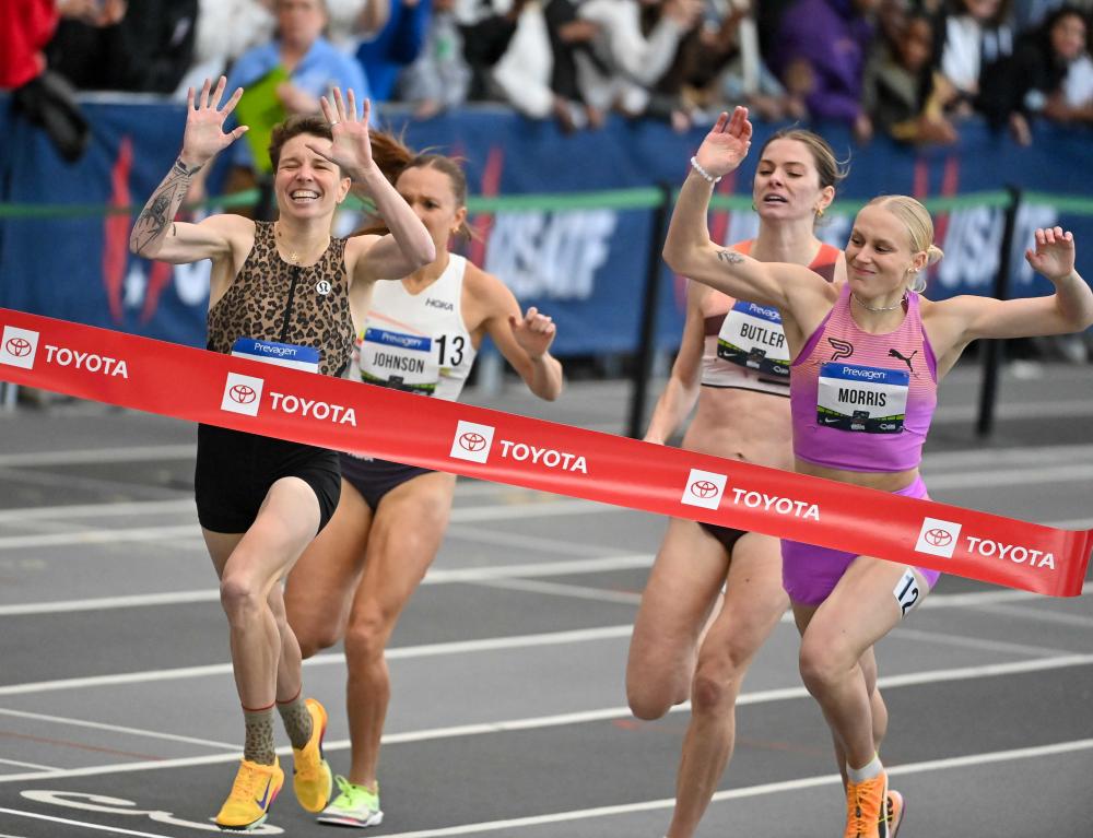 Women's Recap: Hiltz Outkicks Field To Win Tactical Final; Addy Wiley Hangs On To Win 800; Jacious Sears Wins, Maxwell Twins Go 2-3 In 60 Final Oliver Hinson of DyeStat Tavan Smith Photos NEW YORK — Sunday’s 1,500 meters final at the USATF Indoor Championships shook up the American mid-distance scene, but one thing is still clear: Nikki Hiltz is at the top. Hiltz used a classic sit-and-kick approach to claim their fourth consecutive national title, running a sub-60 final 400 meters and breaking the tape in four minutes, 11.34 seconds. Unlike earlier races this season, Hiltz decided to stay patient in this final. Gracie Morris led early, keeping the pace conservative, while Hiltz and the rest of the pack fought for position. When Emily Mackay took the lead heading into the penultimate lap, the entire field was separated by less than three quarters of a second. Lindsey Butler made a daring move to the front, taking the lead through the bell lap and holding it until about the last 50 meters. Coming around the final bend, it was a four-person race as Hiltz, Morris and Sinclaire Johnson chased Butler to the line. Only a quarter of a second separated those four at the end. Hiltz’s kick delivered another win. “It was a crazy (race),” Hiltz said. “But I kind of expected that. There was no one there to make it go fast. I knew it was gonna be kind of chaotic, and I knew the last three laps were gonna be a burner.” Morris took second in 4:11.39, followed by Butler in 4:11.52. Neither the 24-year-old Morris or the 25-year-old Butler had finished in the top three at a U.S. track final before this weekend; Hiltz was excited to see the “young guns” step up and shake up the traditional power structure of American mid-distance running. “I think everyone’s fearless,” Hiltz said of the state of the 1,500 at the moment. “I think that was pretty fearless of those people to make those moves, and I think it’s a great sign that the future’s in good hands.” Hiltz isn't ready give up the throne quite yet. With their win Sunday, they have nine national titles. Wiley Wins Speedy Women’s 800After a 27-second opening lap, the outcome of a stacked women’s 800 final was reduced to one question: who can hold on? For a moment, it looked like Olivia Baker had the upper hand. Baker led the field through 400 in a little over 58 seconds and appeared to be well on her way to claiming her first national title, but she got swallowed up by the pack in the third lap and fell to the back. Addy Wiley took the lead at the bell, followed closely by Valery Tobias and Meghan Hunter. Hunter tried to swing wide in the last turn and surge to the lead, but Wiley didn’t let that happen. She held on with a 29.43-second final lap and broke the tape in 1:59.43, an indoor personal best. In Saturday’s heats, Wiley surged at just the right time and had plenty left in the tank, which gave her a confidence boost heading into the final. “Today, I knew that when I was ready, I just wanted to seal the deal and really push it through the line,” Wiley said. Jacious Sears Wins Women’s 60; Mia Maxwell Ties High School RecordConsistency has been the key for Jacious Sears, and on Saturday, it finally paid off — the 24-year-old earned her first national title with a win in the 60 meter dash. Sears ran 7.05 in the preliminary round and 7.04 in the final, adding two more dominant performances to a season in which she hasn’t run slower than 7.12. Sears said her experience last season — her first full year as a professional — have helped her achieve more consistency in the early going of 2026. “I learned a lot (last year),” Sears said. “I learned how it feels to be at these meets. I think that’s helped me a lot in remembering (to keep) my coaches’ voices in my head.” Last September, Sears represented the stars and stripes in the 4x100 meter relay at the World Athletics Championships in Tokyo; when she goes to Poland for the World Indoor Championships in three weeks, it’ll be her first time running solo for Team USA. If Sears’ victory wasn’t enough evidence of a new generation rising, the performances of Texas twins Mia and Mariah Maxwell (Humble Atascocita TX) sure was. Mia ran 7.13 for second place, tying Lisa Raye’s high school record, while Mariah was just behind in 7.14 for third all-time. Rosey Effiong took the win in the women’s 400, improving upon her second place finish from 2025. The former Arkansas standout said this indoor season has felt different than last year, both in good and bad ways. Thanks to a long 2025 season that culminated in a World Championships appearance, she didn’t start training for the indoor season until December. She missed out on a few weeks of training because of that, but there was a trade-off in terms of freshness, which helped her run a season’s best 51.53 in the final to take the win. Moore Completes Horizontal Jumps DoubleAfter winning her first national title in the long jump on Saturday, Jasmine Moore doubled back in the triple jump on Sunday and won her fourth title in the event, leaping 45-7 (13.89m) to win by almost half a meter. Moore owns two Olympic bronze medals — one in each jump — but she’s never won a medal at a World Championship. She’ll have a chance to match her Olympic hardware when she goes to Poland for the World Indoor Championships later this month. Chloe Timberg dominated the women’s pole vault, clearing a season’s best 15-5 (4.70m) to win her first national title. Timberg, a former NCAA champion at Rutgers, had the cleanest series of the day by far, clinching the win at 4.60 meters with only two misses en route. She had cleared that height twice before during this indoor season, and with two misses on 4.65, it looked like that bar would be the end for her again, but she made a third-attempt clearance and then cleared 4.70 on her second attempt, coming within a centimeter of her PB. Jalani Davis won the women’s