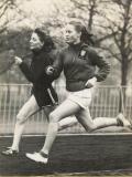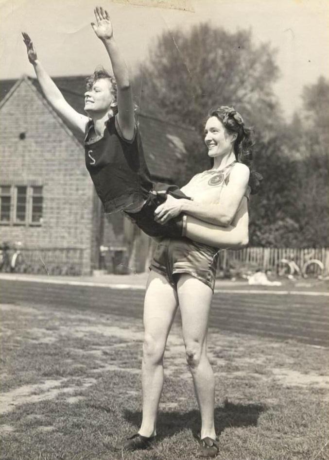Air Lift (Top): In the late ‘40s, teenage Chris McKenzie, aloft, works out with a Selsonia Ladies Club teammate in London, in preparation for a cross-country race in Scotland. Chris won with aggressive tactics that overwhelmed the opposition.