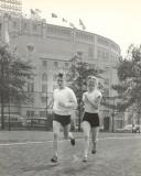 But before Greene could be declared the official winner, there had to be tears, threats, acrimony. Chris, a PAL teammate of Lillian’s, tried to console her as the young girl wept in confusion. Even the sanctimonious Dan Ferris disagreed with Kaszubski’s call. Finally, at the meet, the decision was reversed. Greene was the winner and as an AAU champion on her way to Europe with the American team, men and women, to compete in dual meets against the Soviet Union, Poland, Hungary and Greece. (Chris would have also been on the team but was not yet a U.S. citizen.) Ten years older than the teenage Greene and vastly more experienced, Chris counseled her on running the 800 and what to expect overseas. “Chris was my best friend,” said Greene. “I knew not to be afraid.” Greene considered herself, Chris and Louise Mead, all with the PAL, “the three musketeers.” She recalled with pride, “We were the first integrated track team.” An African-American who grew up in Harlem, Greene was a cultured young woman who attended Hunter College and spoke other languages including enough Russian to help her teammates in Moscow. In Europe, she would face older and stronger opponents with a history of 800 running that had not ceased after the 1928 Amsterdam debacle. Indeed, pressure for longer U.S. women’s running events had come from the Soviet Union, as the U.S.-USSR Cold War dual meet series was set to begin. In addition, Olympic authorities were planning to restore the women’s 800 in the 1960 Games at Rome. That summer of ‘58, the training advice Greene received from U.S. women’s team coach Ed Temple, a sprint specialist, was to “go run with them white boys.” So Greene ran through Gorky Park in Moscow with future distance greats Bill Dellinger and Jim Grelle of Oregon, a shocking mixed-race sight in Moscow. On the four-meet tour, while placing behind her opposition, Greene lowered the U.S. 800 record to 2:18.6. She also set a U.S. 400 mark, 58.4, with a victory in Budapest. “I thought I had died and gone to Heaven,” Lillian told Louise later on. Greene returned home to less freedom than she’d had behind the Iron Curtain. At the 1959 Pan American Games in Chicago, there was no women’s 800 and the 400 was an exhibition race, which Greene won. Because Greene was not competing in an official event, U.S. officials denied her a hotel room and she secretly bunked with Wilma Rudolph, on the verge of superstardom, and other women from the ground-breaking Tennessee State Tiger Belles. One step back, one step ahead. That same year, in another first, U.S. women could run the 440 and 880 at the indoor nationals in Washington, D.C. Around the same time in Washington, in the shadows of the Eisenhower White House, Chris, pregnant with her first child, ran a 10-mile road race while protesting with a t-shirt inscribed with this slogan: “If I Can Carry a Baby For 9 Months, I Can Run 9 Miles.” After Butcher and Greene placed 1-2 in the 1959 outdoor nationals 800, and then 3-4 in the U.S.-Soviet dual meet, held at Franklin Field in Philadelphia, Butcher complained to Track & Field News publisher Bert Nelson that his magazine did not carry the women’s results of the most significant American meet of the year. According to Mead’s book, Nelson responded in part, “I can’t get very excited about girlish athletics. Whatever the reasons, I seem to feel about the same as 99 percent of the track fans I know.” In 1960, an Olympic year, both Chris (who received her American citizenship that spring) and Gordon attempted to make the U.S. team. Chris encouraged Gordon to move up in distance to the marathon. You’d never know it from Gordon’s front-running style, but according to daughter Tina, born the year before, her father would sometimes give up on a workout. Chris had the solution. When Gordon went out for a long run, she’d lock the door of their Bronx apartment, check her watch, and not let him back in until he’d completed the agreed-upon distance.