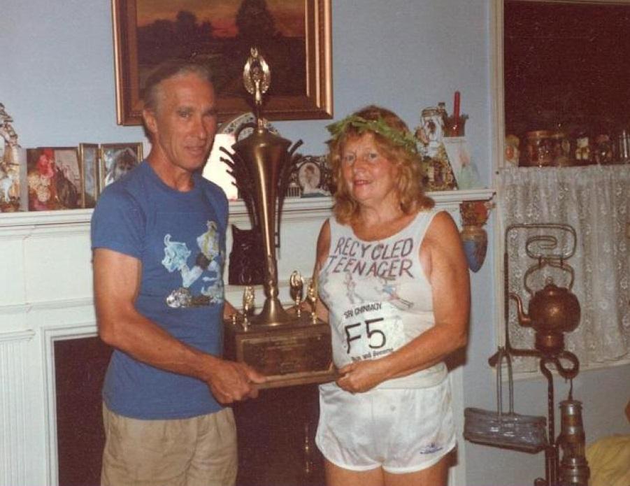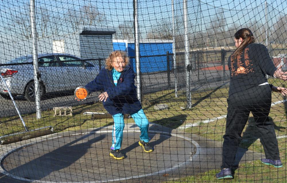 Postscript: ‘Recycled Teenager’ Gordon made up for his poor showing in the 1960 Olympic marathon with a fourth at Boston in 1961 and a silver-medal run at the 1963 Pan Am Games in Sao Paulo. Both he and Chris retired from world-class competition in 1964. They would have three children and seven grandchildren. In her 40s and 50s, Chris won many national masters’ titles while setting numerous age records. Often she wore a t-shirt with the inscription: “Recycled Teenager.” In 1980, she won five events at the Pan Am masters championships in Puerto Rico—a gold medal for each of the daughters in her family, she said. Gordon continued running, walking and doing other sports like handball. While in seeming good health and fully active, he died suddenly in 2013 at 86 after a family trip. Gordon and Chris had been married for 58 years. Chris still lives in their Great Neck home surrounded vy Gordon’s trophies and photos from around the world. Every night at bedtime, Chris kisses her sacred “runner necklace” made for her by Gordon after they ran a race together in the ‘80s. Early on, Chris had become a coach for the PAL and was recently honored by the organization for her longstanding contributions. In one of her finest moments, Chris coached PAL kids in the long jump by laying her 80-plus year old body on the take-off board and fearlessly instructing the youngsters to leap over her. Chris continued running into her late 70s, competed in masters’ shot put and discus and, at 85, coaches those events with her son, Adam’s, high school boys team—Great Neck North. At a recent team practice, Chris demonstrated technique in the shot and discus rings with the same athletic purity that marked her running career. She’s big on feet. Watching the team warm up, Chris called repeatedly, “Pick up your feet. Listen to your feet.” Adam said, “The guys love her. I joke around with the half-milers, ‘My mother can run faster than you.’ I have a sign posted, ‘Can you run faster than coach McKenzie’s mom?’”